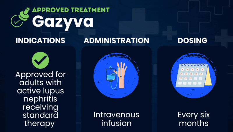 Gazyva (obinutuzumab) is a medication approved in the U.S. for adults with active lupus nephritis who are receiving standard therapies. The treatment is given via infusions into the bloodstream (intravenously).